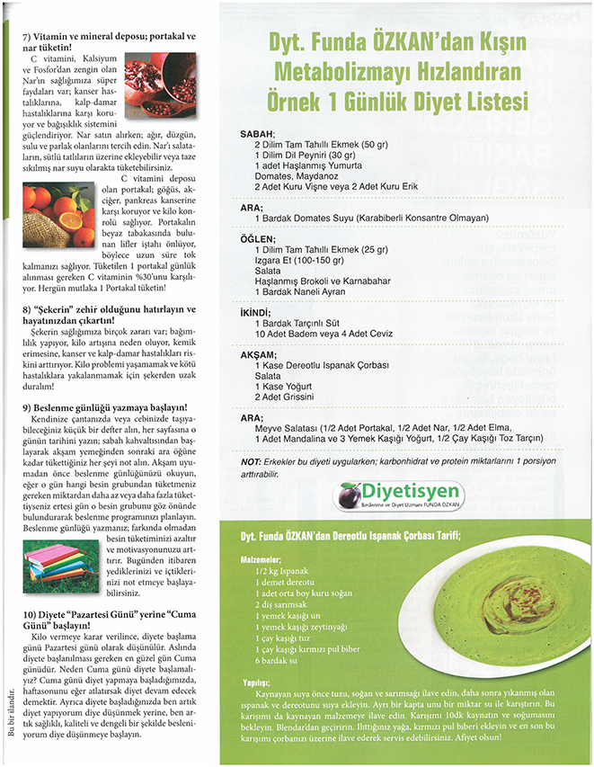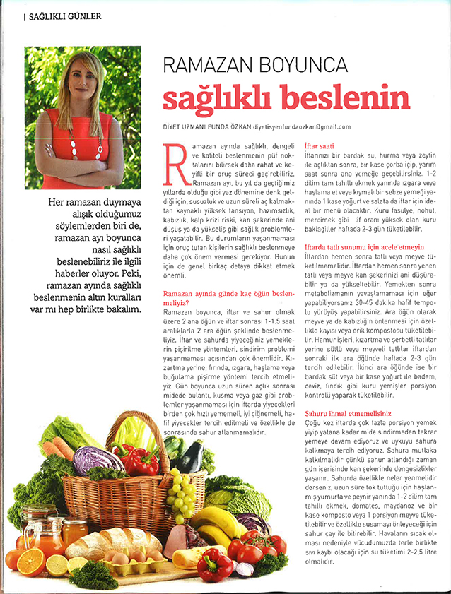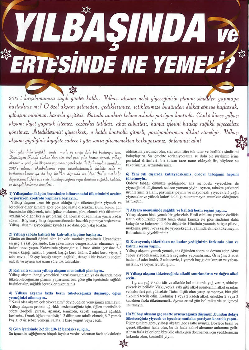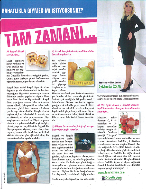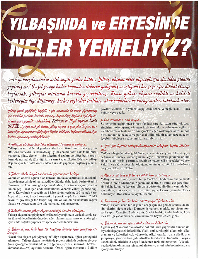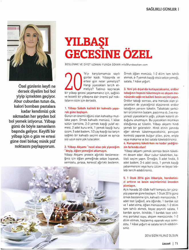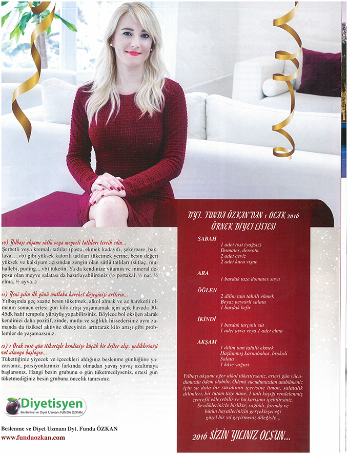 23 ARALIK 2015 ŞAMDAN PLUS Dergisinde yayınlanan ‘’Yılbaşında ve Ertesinde Neler Yemeliyiz?’’ ve ‘’Dyt. Funda ÖZKAN’dan 1 Ocak 2016 Örnek Diyet Listesi’’ başlıklı yazılarımı okuyabilirsiniz.. |