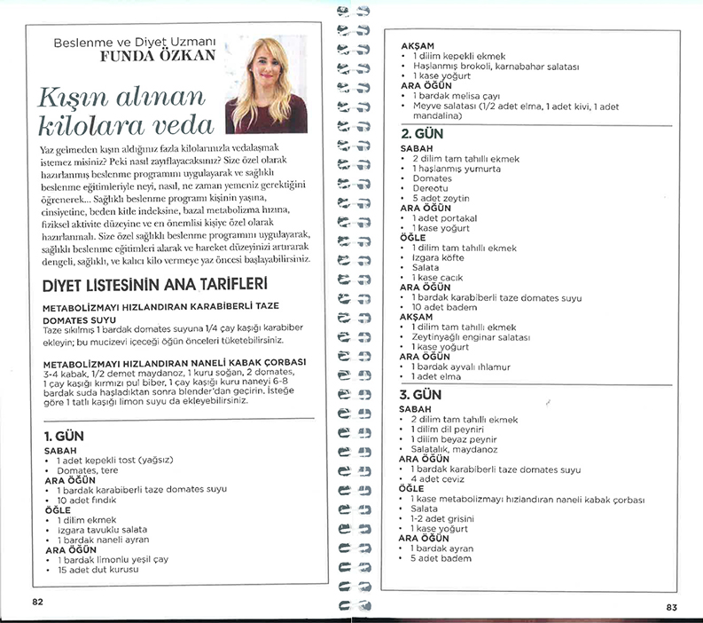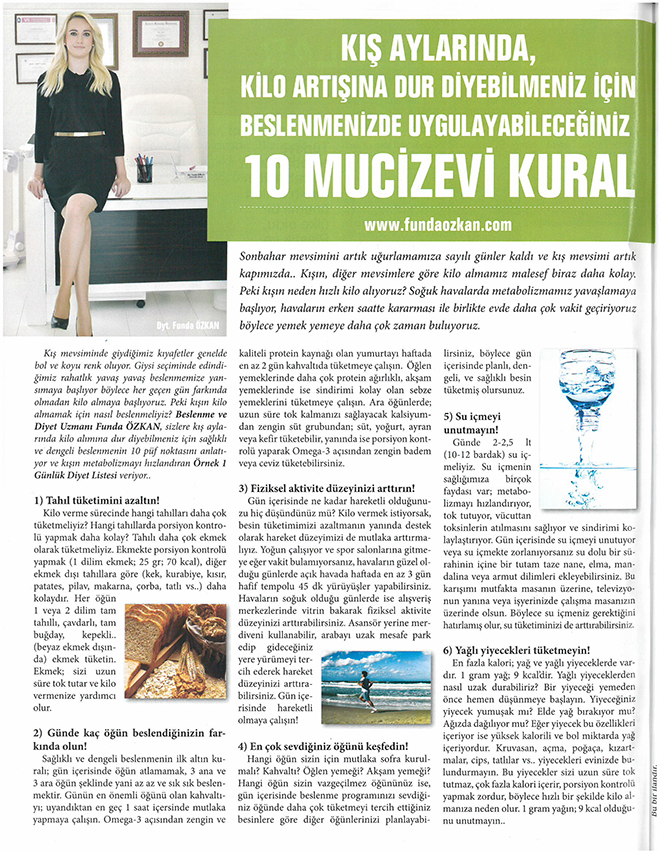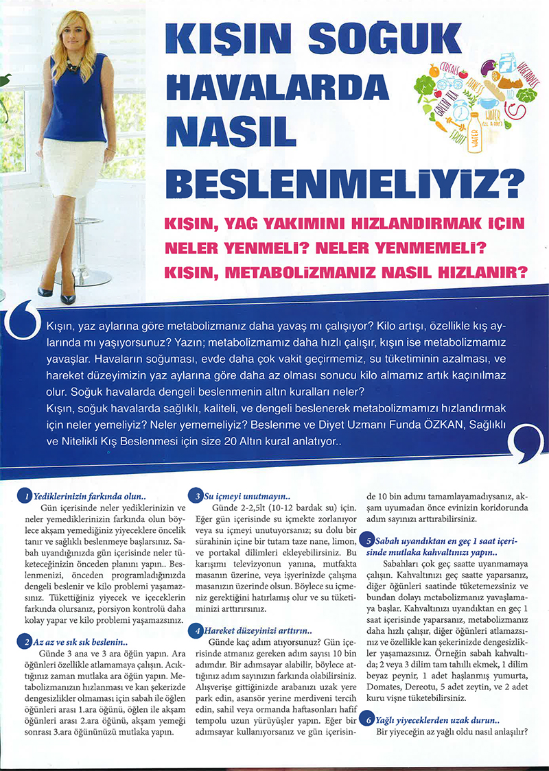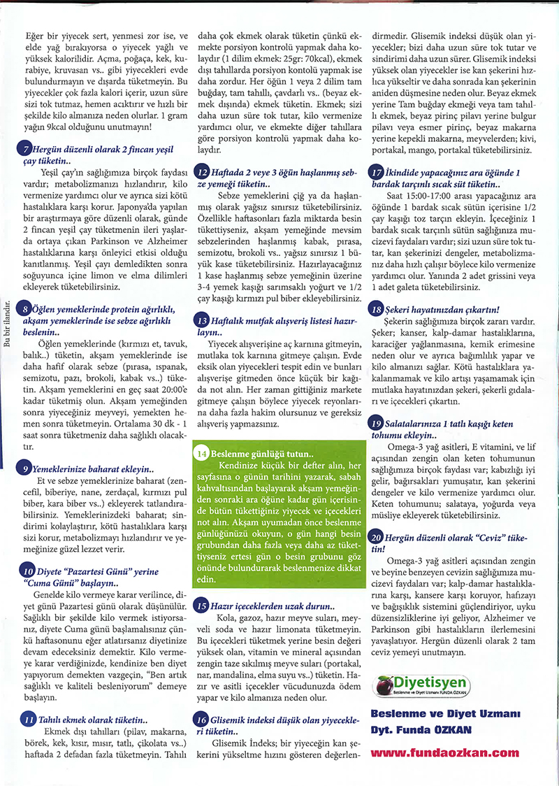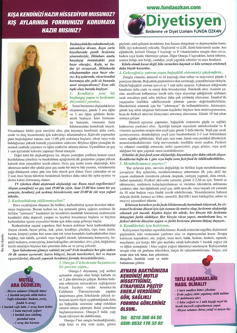 23 ARALIK 2015 ŞAMDAN PLUS Dergisinde yayınlanan ‘’Yılbaşında ve Ertesinde Neler Yemeliyiz?’’ ve ‘’Dyt. Funda ÖZKAN’dan 1 Ocak 2016 Örnek Diyet Listesi’’ başlıklı yazılarımı okuyabilirsiniz.. |