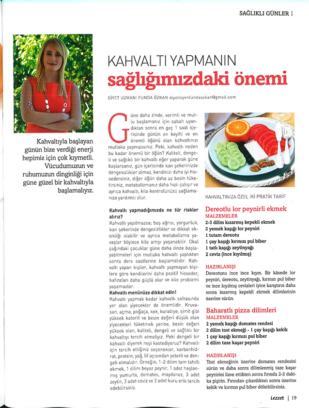 LEZZET Dergisinin 2015 Ağustos Sayısında yazdığım "Kahvaltı Yapmanın Sağlığımızdaki Önemi" başlıklı yazımı mutlaka okuyun... |