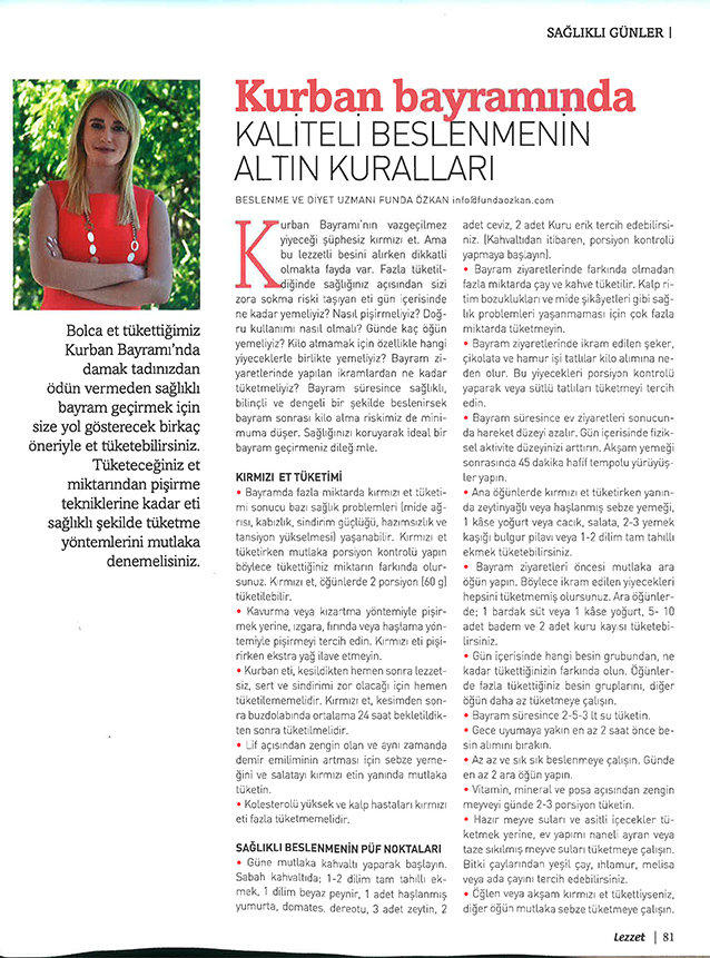LEZZET Dergisinin 2015 Eylül Sayısında yazdığım "Kurban Bayramında Kaliteli Beslemenin Altın Kuralları" başlıklı yazımı okuyabilirsiniz... |