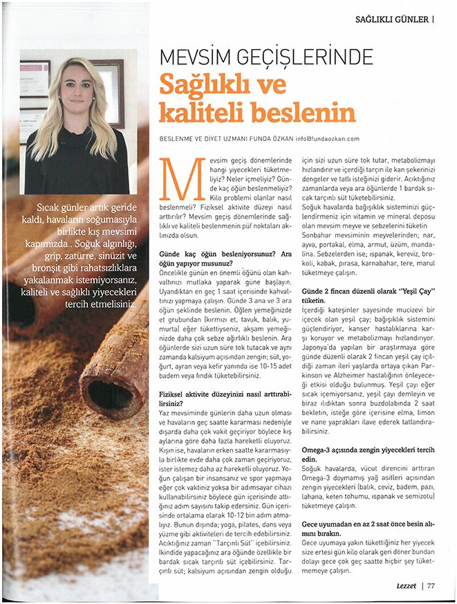 LEZZET Dergisinin 2015 Kasım Sayısında yazdığım "Mevsim Geçişlerinde Sağlıklı ve Kaliteli Beslenin " başlıklı yazımı okuyabilirsiniz... |