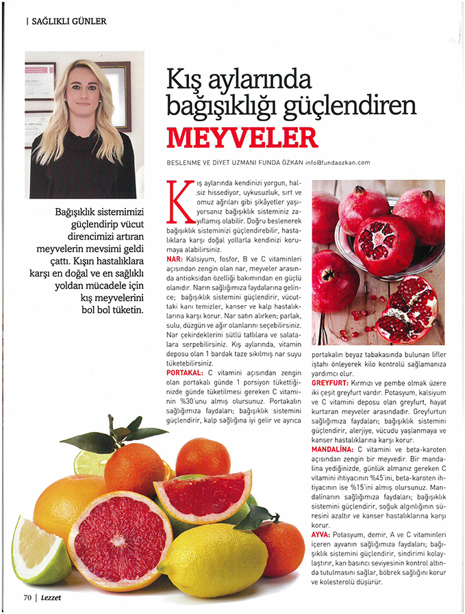 LEZZET Dergisinin 2016 Ocak Sayısında yazdığım "Kış Aylarında Bağışıklığı Güçlendiren Meyveler" başlıklı yazımı okuyabilirsiniz.. |